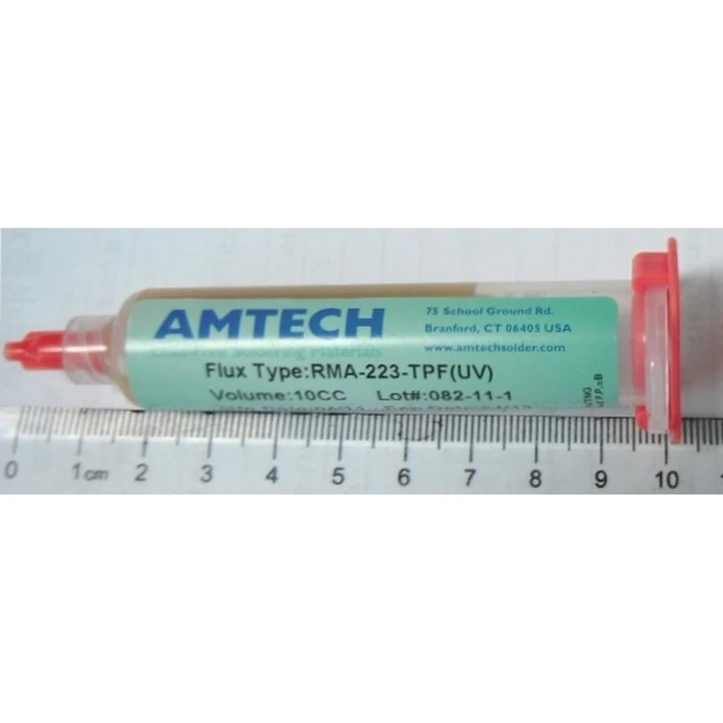Flux on polüpropüleenist süstlas, netosisuga 10 cc (umbes 10 g, sõltuvalt tihedusest). Vaigupõhine koostis, ilma söövitavate materjalideta, ning lahustub enamikus emaplaadi puhastusvahendites. Tüüpilised süstla mõõdud: pikkus 98 mm, läbimõõt 22 mm; kogukaal koos pakendiga umbes 20 g.