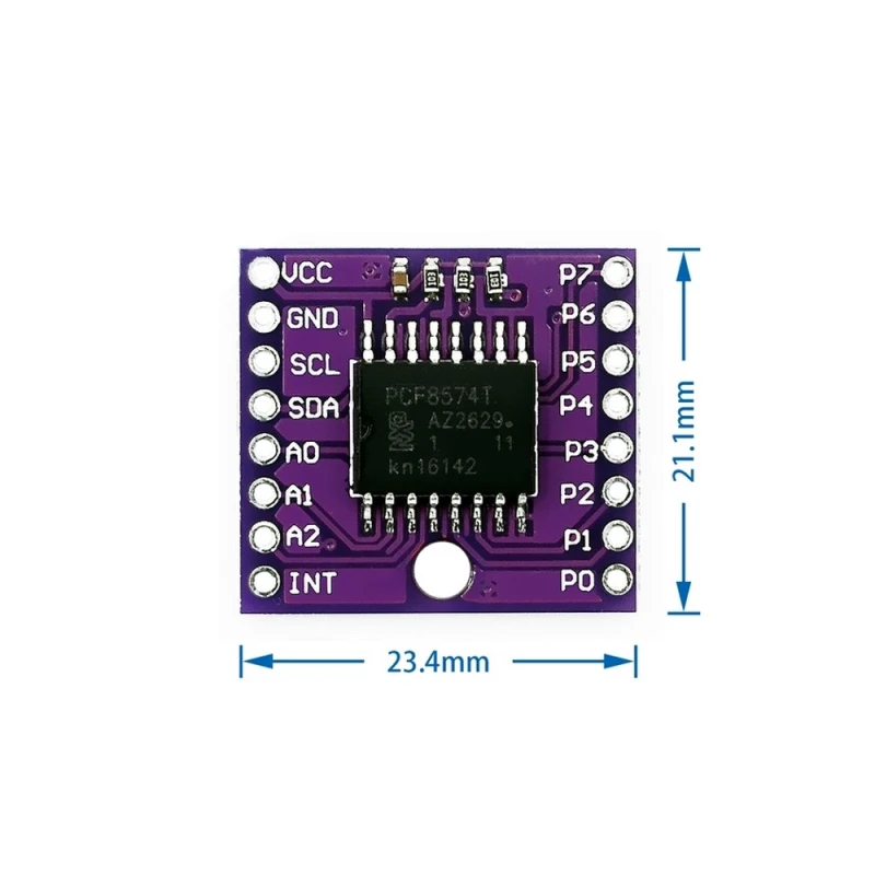 I2C PCF8574T moodul Arduino jaoks on sisend-/väljundportide (E/S) laiendaja, mis on loodud Arduino projektide võimaluste suurendamiseks I2C-liidese kaudu. See moodul võimaldab lisada mitu täiendavat digitaalset E/S jalga ilma mikrokontrolleri rohkem jalgu kasutamata, lihtsustades välisseadmete nagu andurite, täiturite või ekraanide juhtimist.