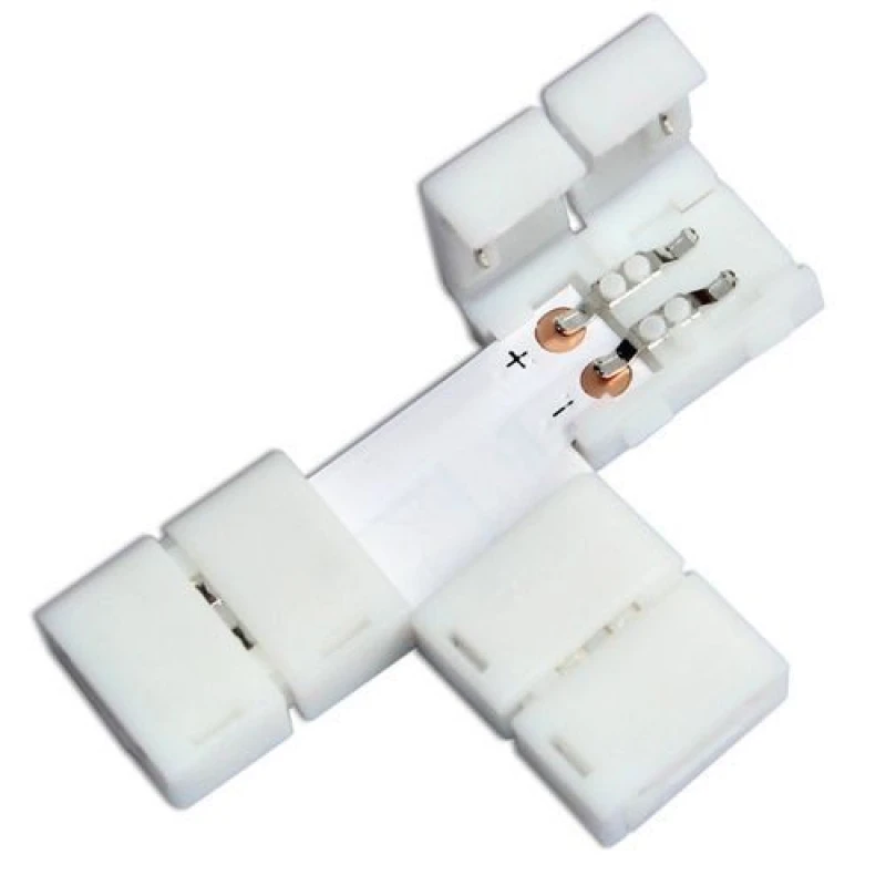 LED T-kujulised ühendused 10mm 2 pin 5050/5630 RGB on tarvikud, mis on loodud 10 mm RGB LED-ribade ühendamise lihtsustamiseks ilma jootmiseta. Need võimaldavad ühendada kaks või enam riba T-kujuliselt, laiendades disaini- ja paigaldusvõimalusi LED-valgustusprojektides.