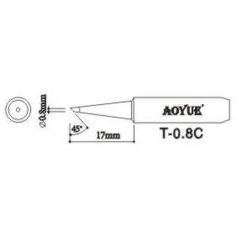 Aoyue T0,8c otsiku jootmisotsas on läbimõõt 0,8 mm ja kogupikkus ligikaudu 42 mm. Kaal on umbes 5 g, kuigi see võib tootmispartii järgi veidi erineda.