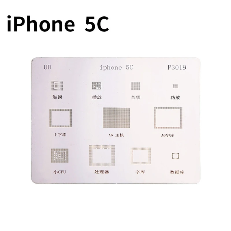 See stencil on spetsiaalselt loodud iPhone 5C-s kasutatavate BGA-integratedi jaoks. Ühilduvus teiste mudelitega on piiratud, kuna pad’ide paigutus võib iPhone’i versioonide ja mudelite lõikes erineda.